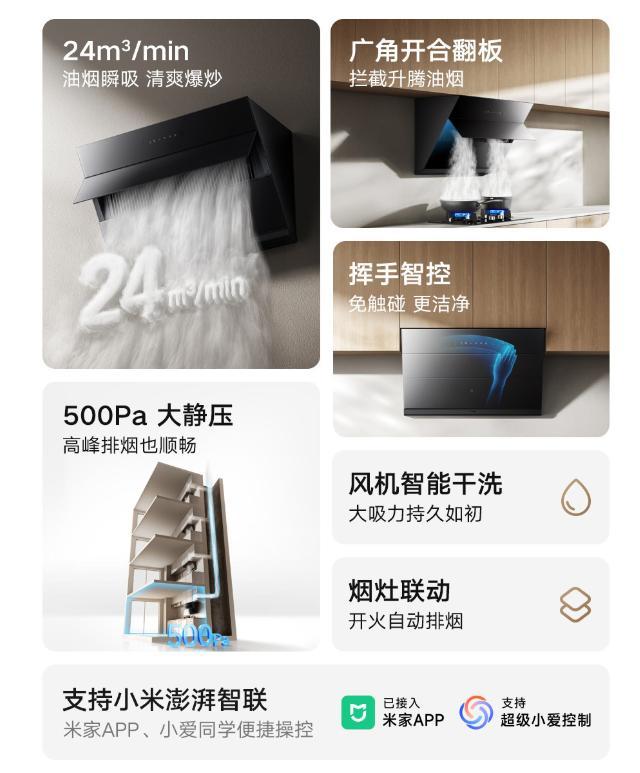 IT之家从商品页面获悉,这款新品搭载全塑封高速电机,支持 24m³/min 大吸力、60° 翻板广角拢烟、500Pa 静压、烟灶联动。此外,该产品还采用手势感应技术,隔空挥手即可开关机、调挡位,避免“油手”弄脏烟机面板。